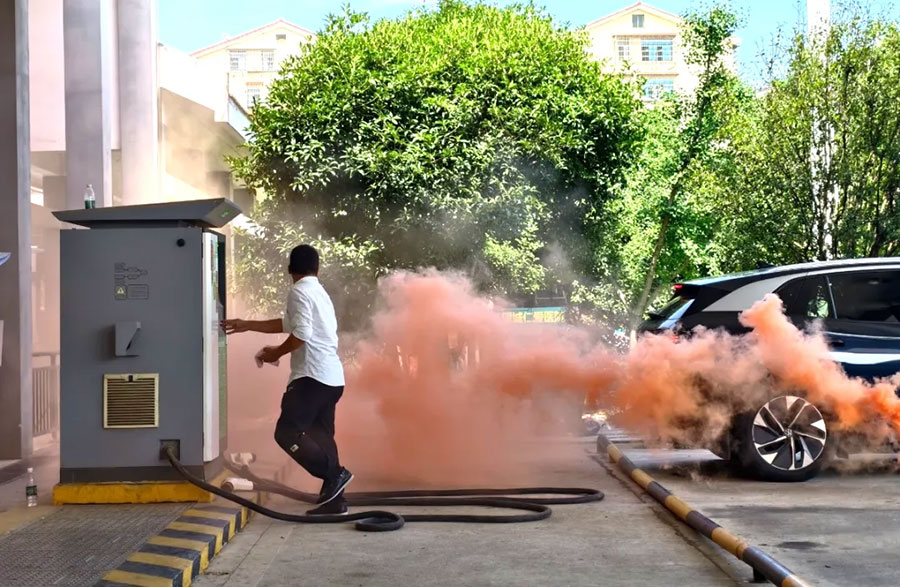 在新能源充電樁火災處置演練科目中,新綠新能源團隊主導此科目,公司團隊人員展示了快速、高效的應急處置能力。演練模擬了充電站內一處充電樁因電氣故障引發火災,現場濃煙滾滾,火勢迅速蔓延。團隊人員迅速做出反應,立即啟動應急預案,按照 “斷電 - 滅火 - 隔離” 流程,果斷切斷電源,使用滅火器迅速撲滅明火,并將周圍車輛移至安全區域,有效控制了火勢的蔓延,避免了更大的損失。這個科目直接針對公司業務核心,展示了充電安全的專業水準。